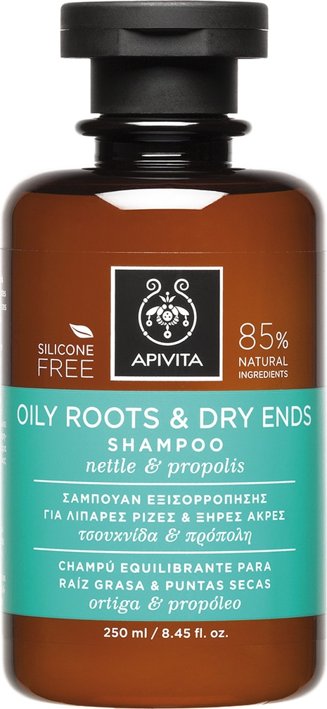 Σαμπουάν Apivita εξισορρόπησης για λιπαρές ρίζες και ξηρές άκρες με 85% φυσικά συστατικά.