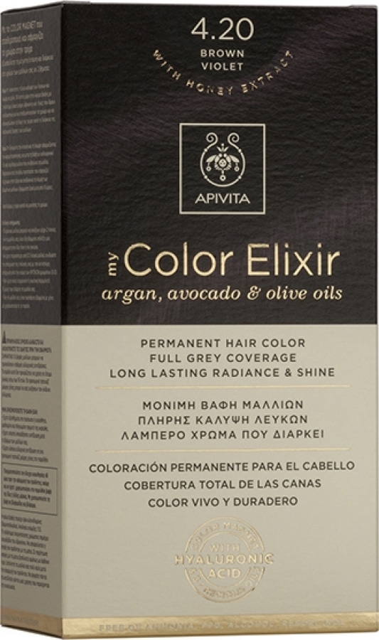 Μόνιμη βαφή μαλλιών Apivita My Color Elixir 4.20 Καστανό Βιολετί, ειδικά σχεδιασμένη με γνώμονα τη φυσικότητα, το επαγγελματικό αποτέλεσμα και με απόλυτο σεβασμό στο τριχωτό.