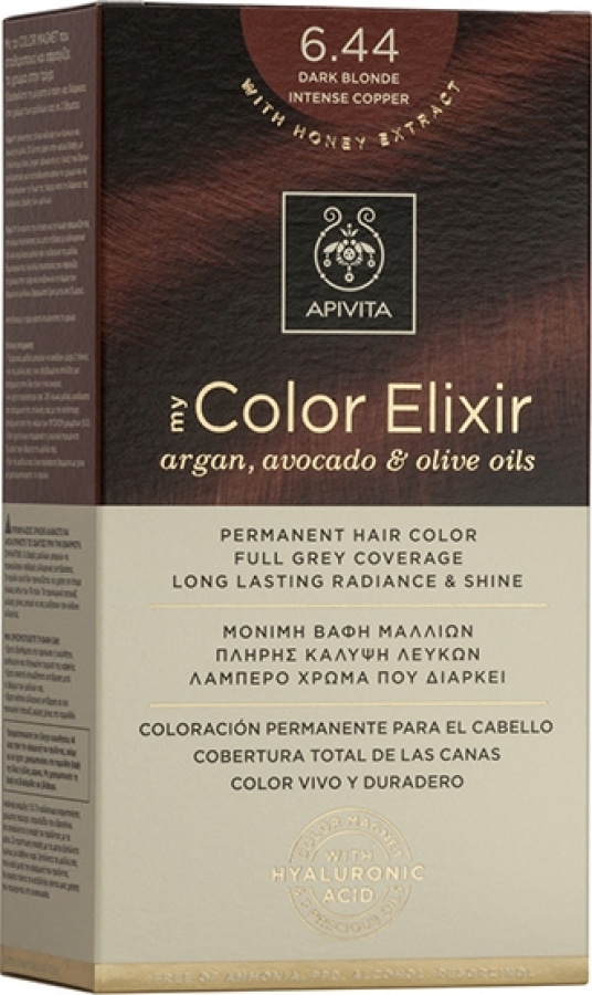 Μόνιμη βαφή μαλλιών Apivita My Color Elixir 6.44 Ξανθό Σκούρο Έντονο Χάλκινο, ειδικά σχεδιασμένη με γνώμονα τη φυσικότητα, το επαγγελματικό αποτέλεσμα και με απόλυτο σεβασμό στο τριχωτό.