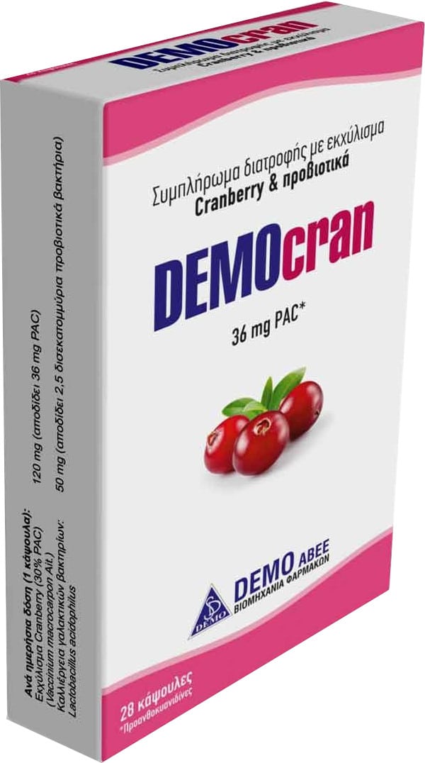 Εκχύλισμα Demo Democran Cranberry με Προβιοτικά για την υγεία του ουροποιητικού και του κόλπου και για την εξάλειψη της ανάπτυξης των παθογόνων βακτηρίων.