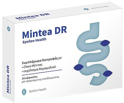 Συμπλήρωμα διατροφής Epsilon Health Mintea DR σε κάψουλες με μέντα και χαμομήλι για καταπράυνση των γαστρεντερικών διαταραχών .