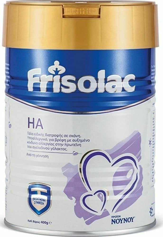 Υποαλλεργικό βρεφικό γάλα Frisolac HA για βρέφη με αυξημένο κίνδυνο αλλεργίας στην πρωτεϊνη αγελαδινού γάλακτος.