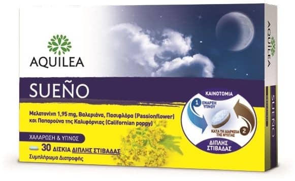 Το Aquilea Sueno είναι δισκίο δύο στιβάδων, ειδικά σχεδιασμένο ώστε τα συστατικά του να απελευθερώνονται όπως χρειάζονται. Η πρώτη στοιβάδα απελευθερώνεται γρήγορα συμβάλλοντας στην μείωση του χρόνου που χρειαζόμαστε για να αποκοιμηθούμε, ενώ η δεύτερη στοιβάδα απελευθερώνεται σταδιακά κατά τη διάρκεια της νύχτας.