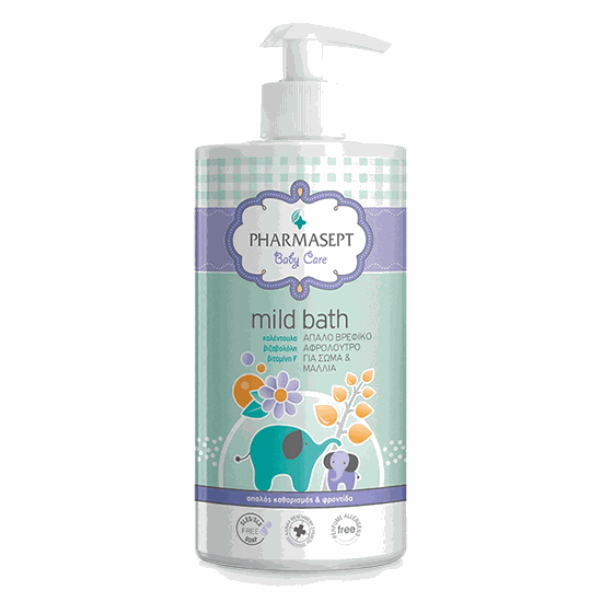 Φυσικό βρεφικό αφρόλουτρο Pharmasept Tol Velvet Baby Mild Bath, χωρίς αλκάλια ή σαπούνι, που καθαρίζει απαλά το σώμα και τα μαλλιά.