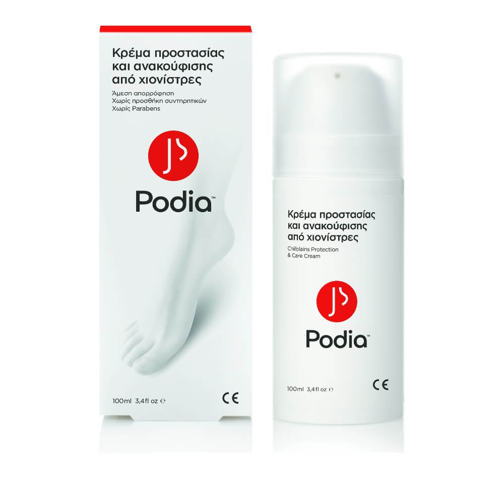 Κρέμα ποδιών Podia για προστασία & ανακούφιση από χιονίστρες σε περιέκτη Airless 100 ml Προσφέρει ανακούφιση από τον κνησμό (φαγούρα) και το αίσθημα καύσου Καταπραΰνει το δέρμα σας από κοκκινίλες και ερεθισμούς Ενισχύει το φυσικό προστατευτικό φραγμό του δέρματος Χαρίζει αίσθηση δροσιάς