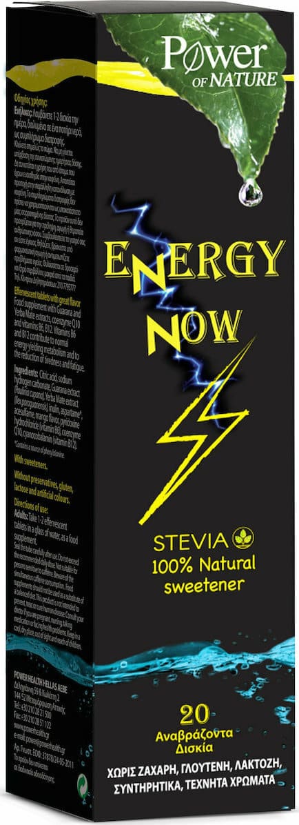 Power Of Nature Energy Now Stevia 20 αναβράζοντα δισκία Φυσικό, τονωτικό συμπλήρωμα διατροφής με Guarana, Yerba Mate, Q10 και βιταμίνες Β6, Β12 που σκοπεύει να τονώσει το σώμα και τη διάθεση.