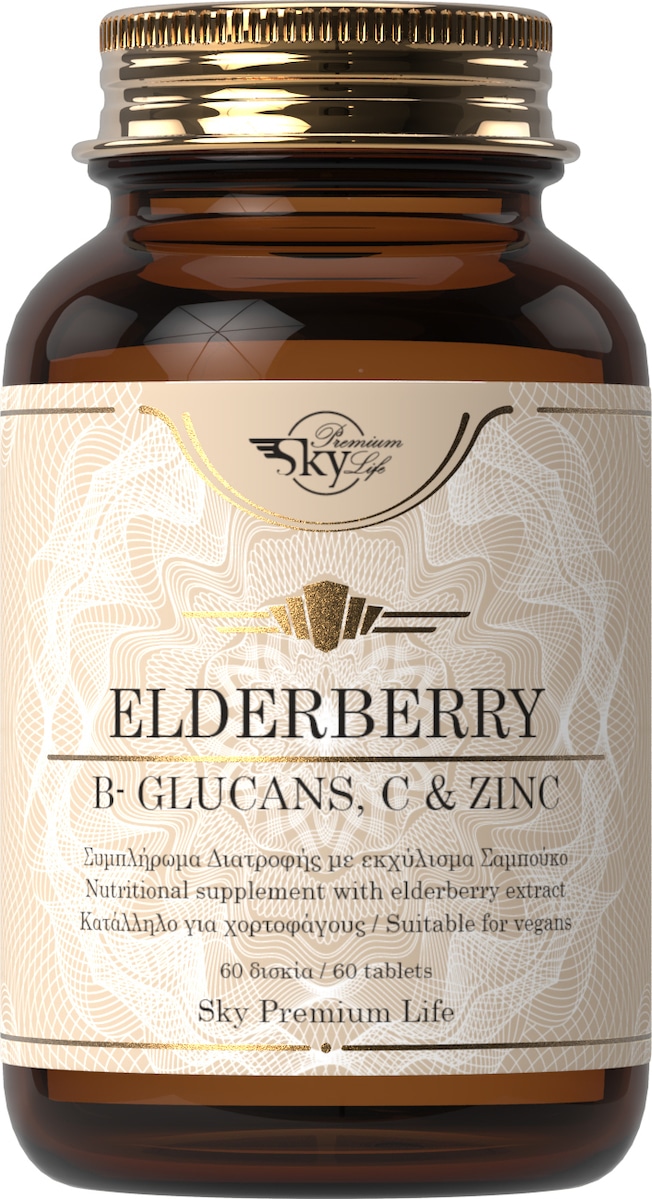 Ενισχυμένο συμπλήρωμα διατροφής Sky Premium Life Elderberry B-Glucans Vitamin C & Zinc με σαμπούκο, βήτα-γλυκάνες, βιταμίνη C & ψευδάργυρο, για δυνατό ανοσοποιητικό και μείωση της κόπωσης.