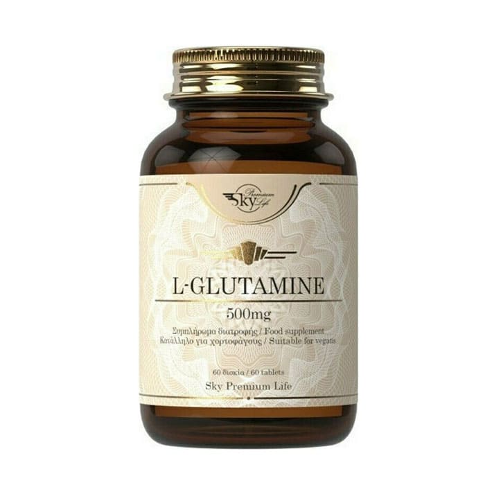 Συμπλήρωμα διατροφής Sky Premium Life με γλουταμίνη, η οποία είναι ένα ημι-απαραίτητο αμινοξύ που μπορεί να παραχθεί από τον οργανισμό και συμβάλλει κατά κύριο λόγο στην ενίσχυση του ανοσοποιητικού, την υγεία του εγκεφάλου και του πεπτικού συστήματος.