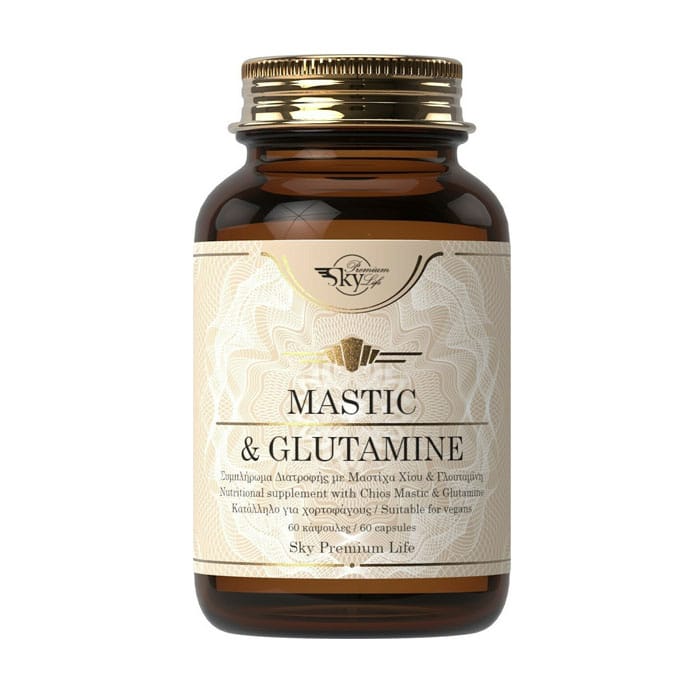Συμπλήρωμα διατροφής Sky Premium Life Mastic & Glutamine με Μαστίχα Χίου και γλουταμίνη που μπορεί να συμβάλλει στη φυσιολογική λειτουργία του γαστροπεπτικού συστήματος.