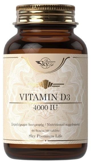 Συμπλήρωμα διατροφής Sky Premium Life Vitamin D3 4000iu με 4000IU βιταμίνη D3 που συμβάλλει στη διατήρηση της φυσιολογικής κατάστασης των οστών και των δοντιών και στην καλή λειτουργία του ανοσοποιητικού συστήματος.