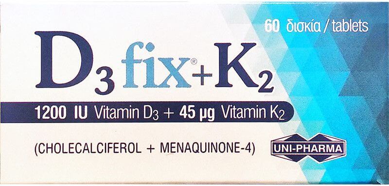 Φυσικό συμπλήρωμα διατροφής Uni-Pharma D3 Fix 1200iu + K2 45mg με βιταμίνη D3 και βιταμίνη Κ2.