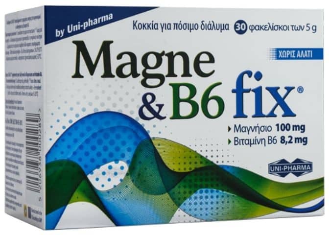Το συμπλήρωμα διατροφής Uni-Pharma Magne & B6 Fix συμπληρώνει τις ημερήσιες ανάγκες του οργανισμού σε μαγνήσιο και βιταμίνη Β6.