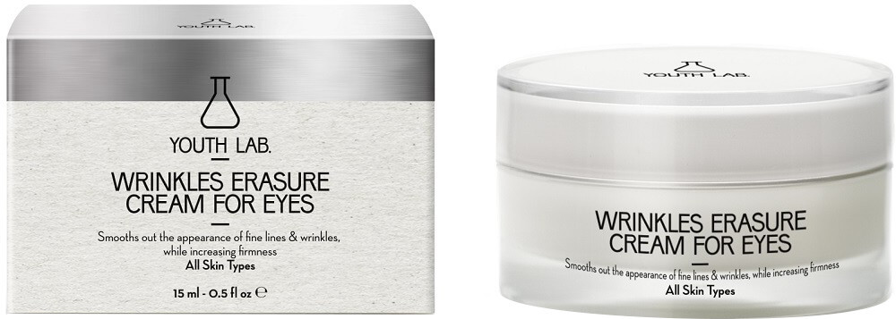 Κρέμα ενισχυμένης σύνθεσης Youth Lab. Wrinkles Erasure Cream For Eyes All Skin Types που εξασφαλίζει τη λείανση των ρυτίδων στο “πόδι της χήνας”, την αναδόμηση του φυσικού φραγμού προστασίας της επιδερμίδας και τη βελτίωση της μικροκυκλοφορίας και της λεμφικής κυκλοφορίας στο κάτω βλέφαρο.